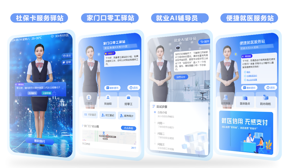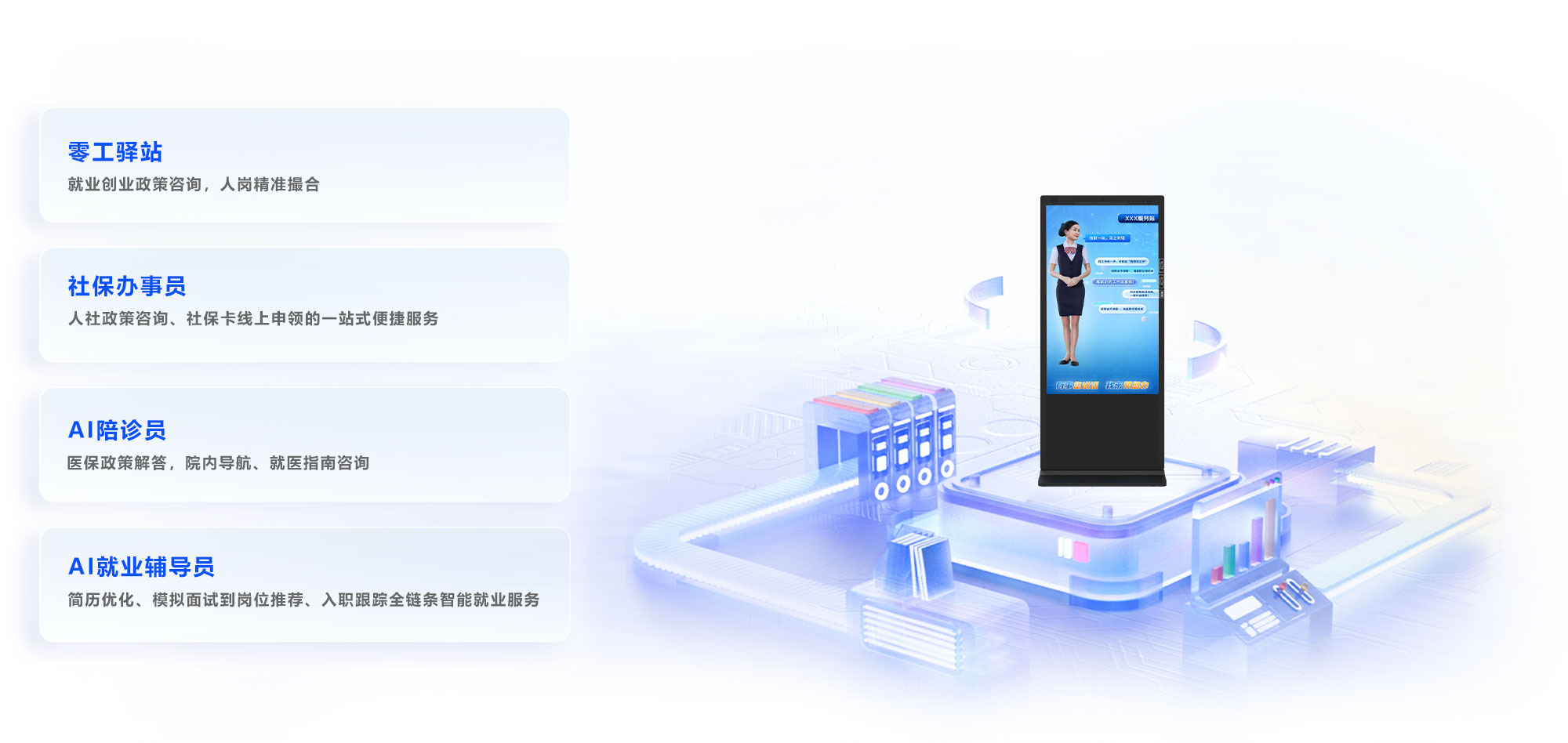 伟德bv1946官网AI+服务站以多样化的智能硬件设备为载体,结合虚拟数字人、场景化大模型等数字化新质生产力,赋能政务、医疗、教育服务场景,为群众提供面对面咨询问答、业务导办帮办等功能,助力窗口服务数智化升级。