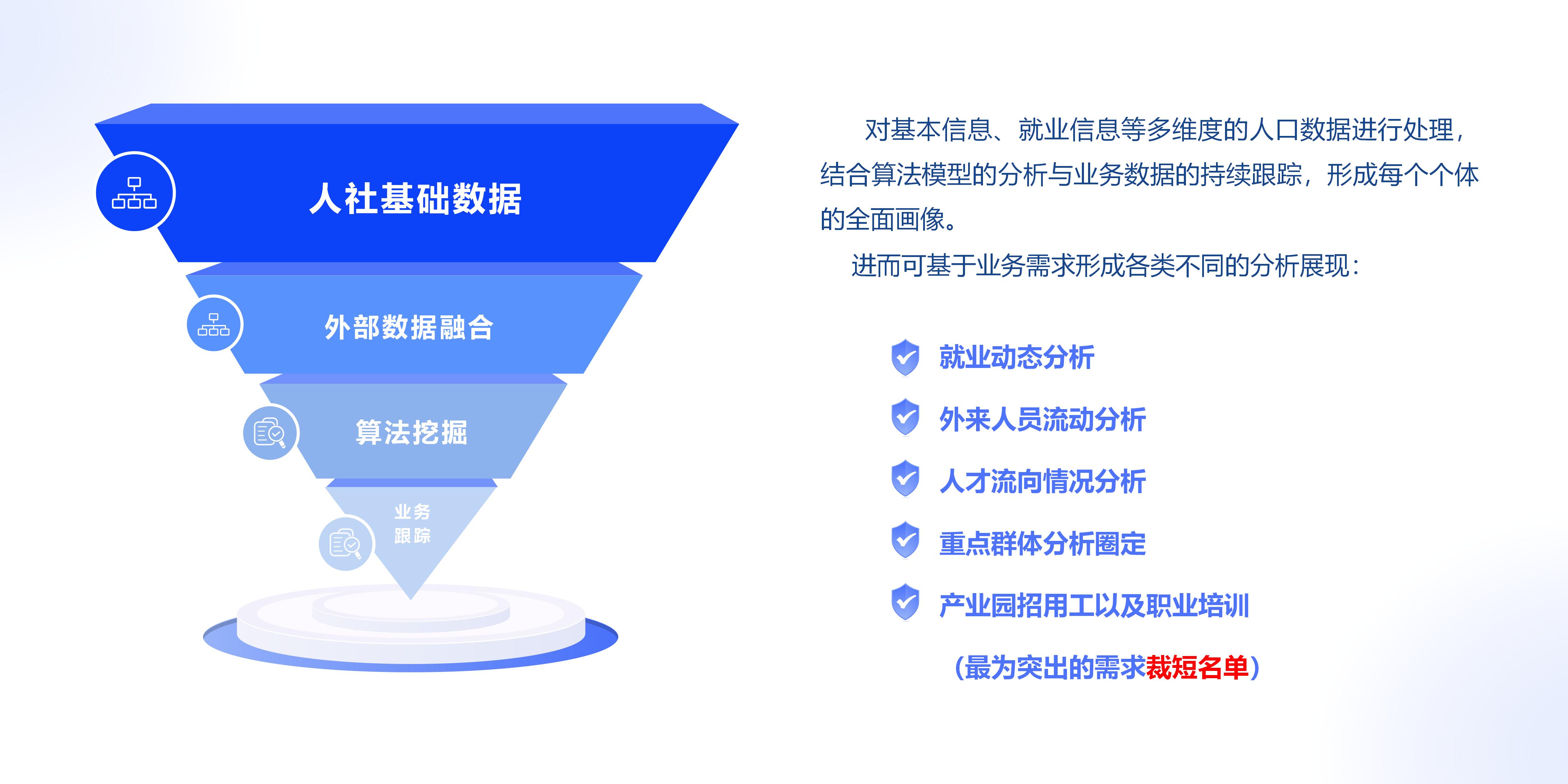 以城市为单位,通过人社基础数据、与其它政府部门数据以及社会数据、互联网数据的汇聚、融合、分析,建立覆盖全市的外出务工人员、高校毕业生等各类劳动力人群热力分布情况,助力人社部门为各类专项人群提供更精准的服务。