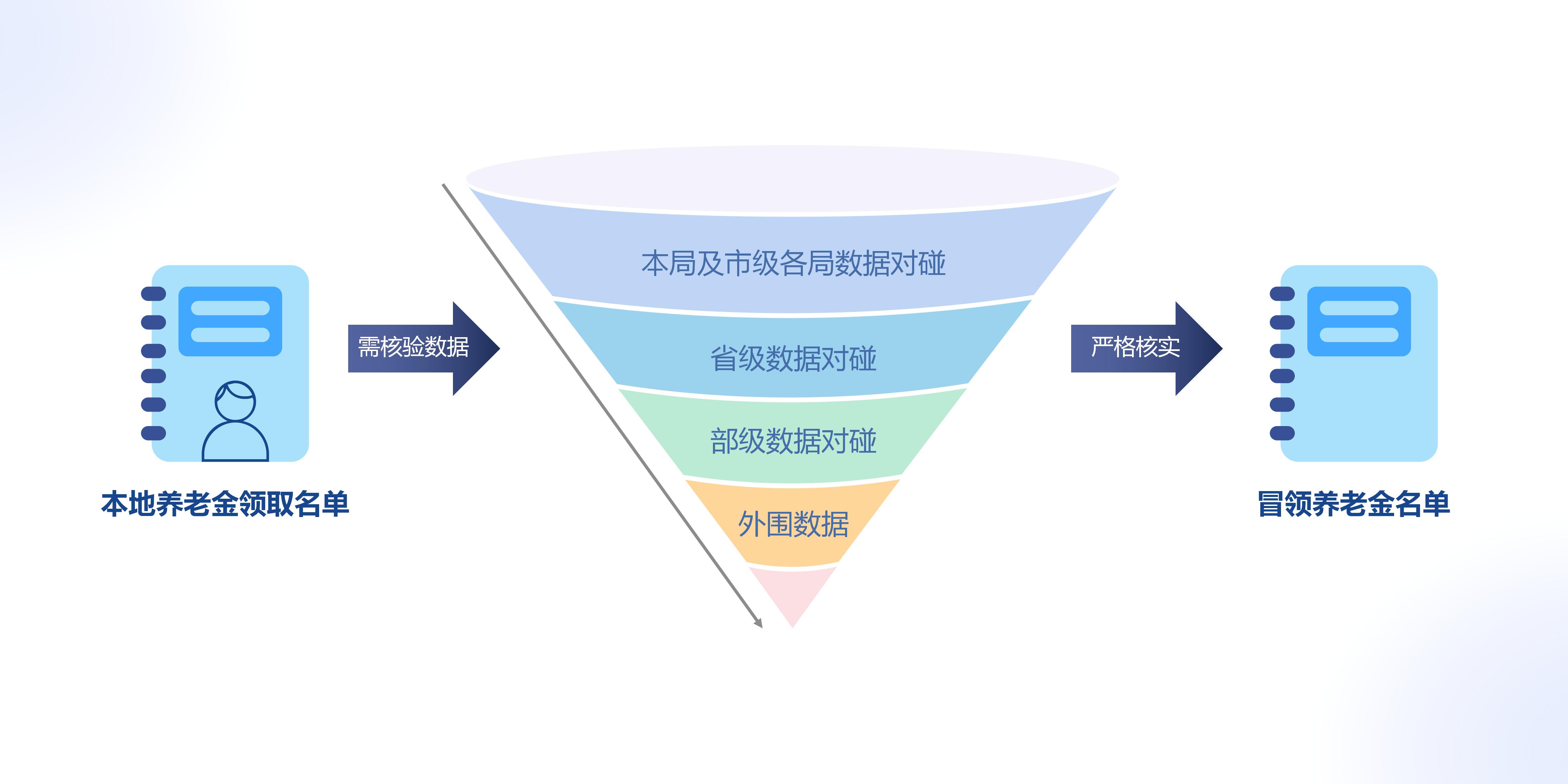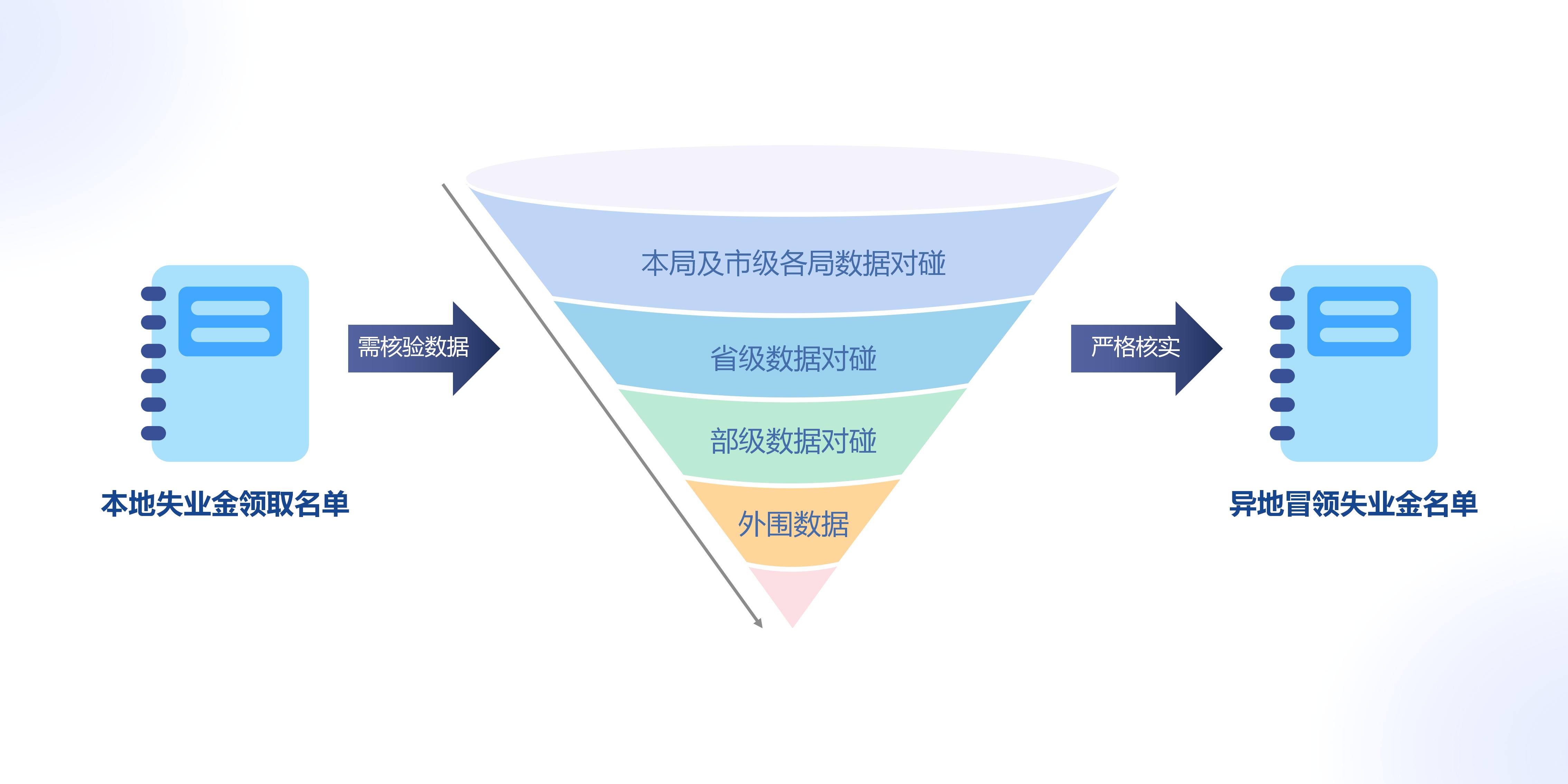 以本市人社数据为基础,融合“市->省->部->外围数据”,通过漏斗形数据对碰的方式排查出在外地就业,却在领取本地失业金的冒领人员名单,对冒领资金依规追缴,确保失业保险基金安全,保障参保人的合法权益。