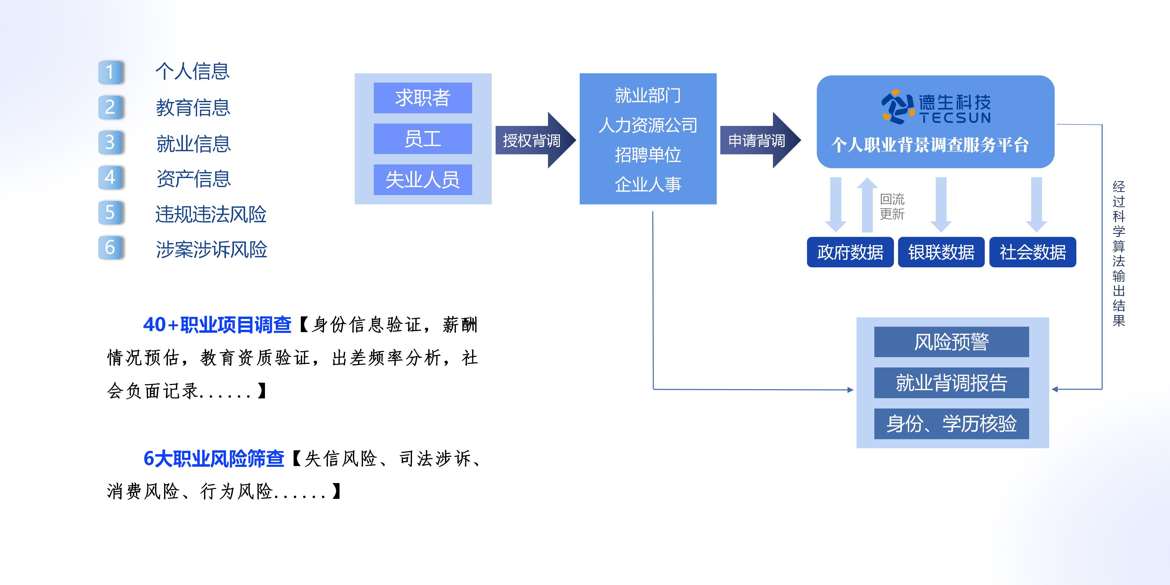 以本地户籍数据、外来人口数据、人社就业数据、公安违法违规数据及社会数据等为支撑,可按照委托方及应聘候选人提供的基础信息,通过专业调查流程、算法逻辑形成背调报告。本产品向获得当事人授权的单位或个人提供查看权限,以精准匹配、降低招聘风险为目的,应用于人力资源公司职业背景调查,招聘单位的员工入职背调;或为企业对在职高管及员工、进行定期职业风险评估提供参考。