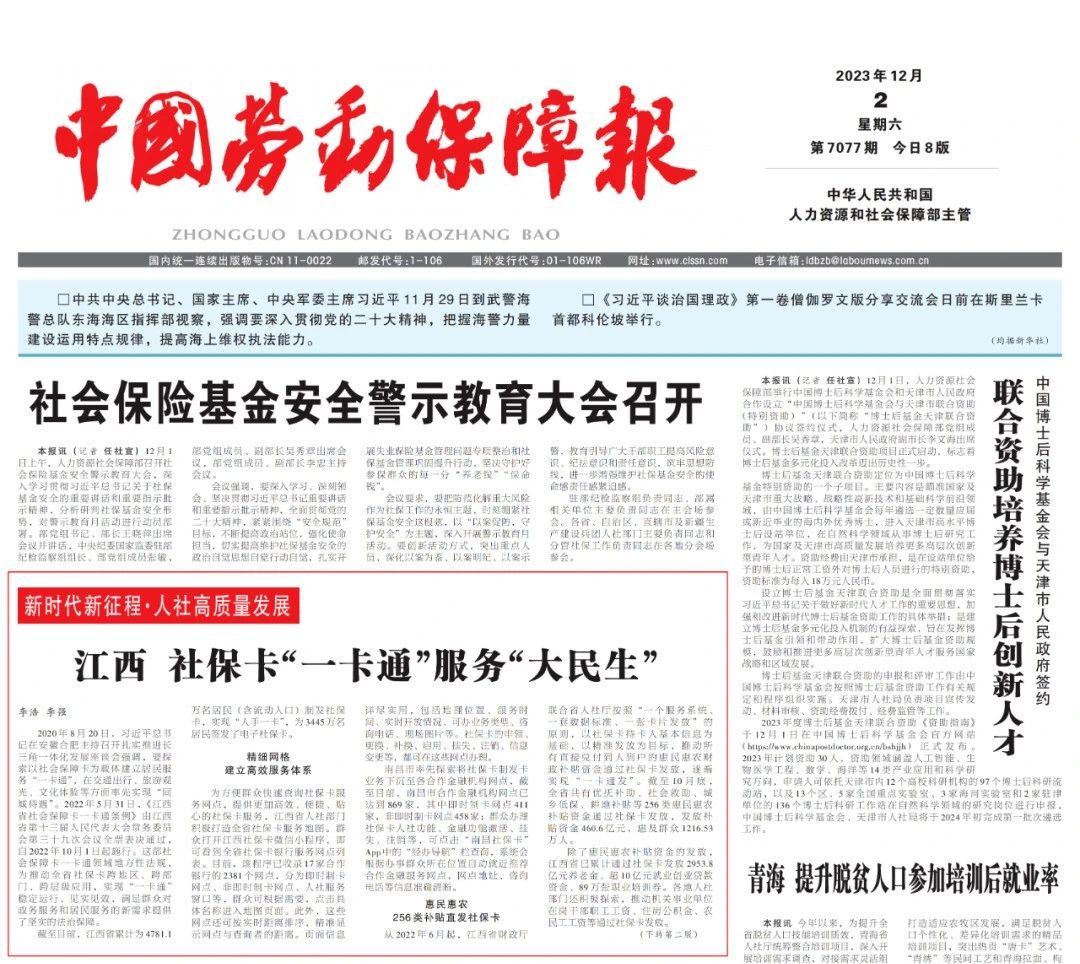 12月2日,中国劳动保障报首版刊发了《江西 社保卡“一卡通”服务“大民生”》一文,详细报道江西以社会保障卡为载体建立居民服务“一卡通”的惠民实践。作为江西省社保卡“一卡通”综合服务商,伟德bv1946官网以应用赋能、服务赋能、数据赋能,助力江西不断拓展居民服务“一卡通”场景应用,让广大群众共享数字化发展成果。