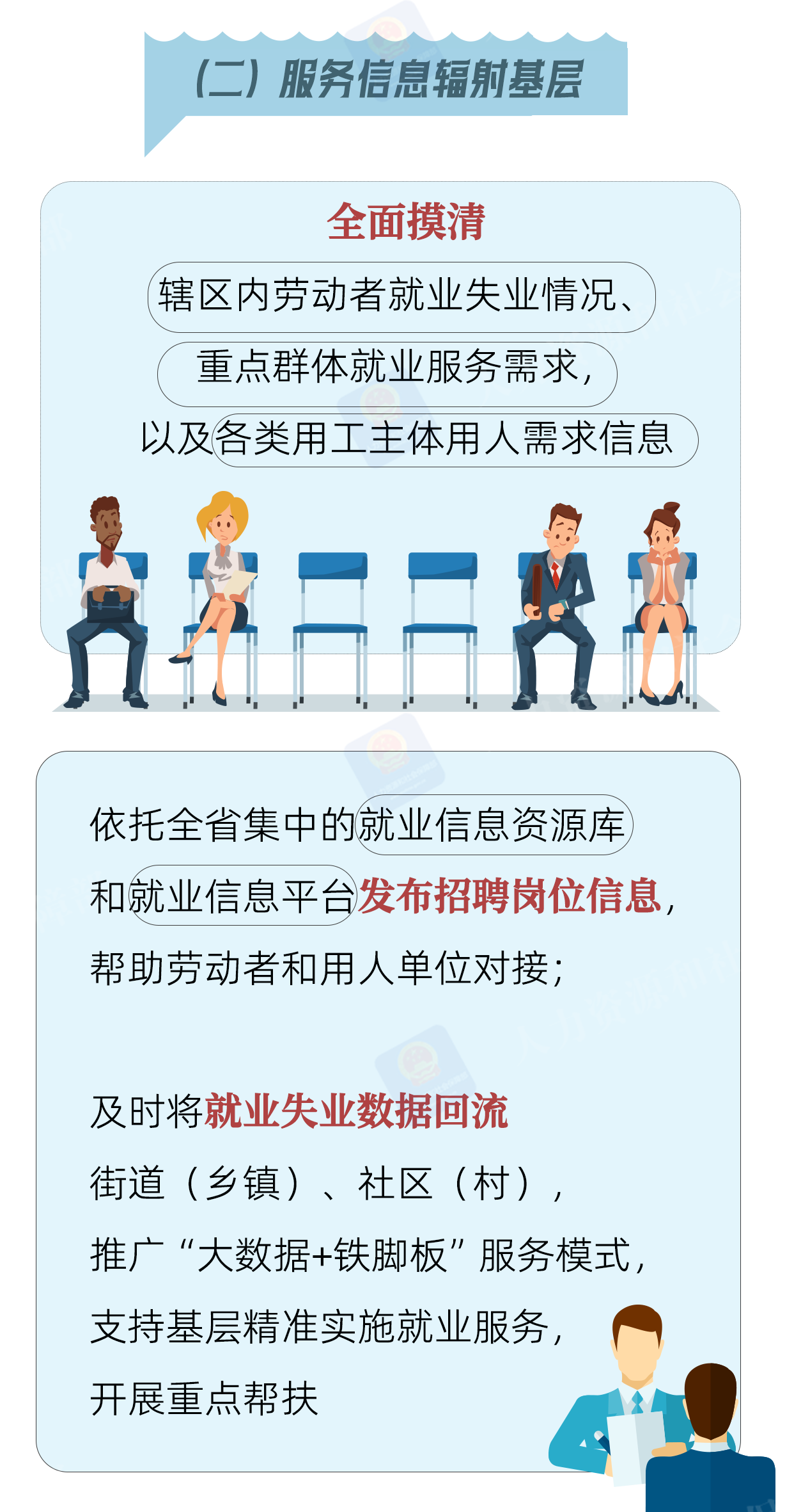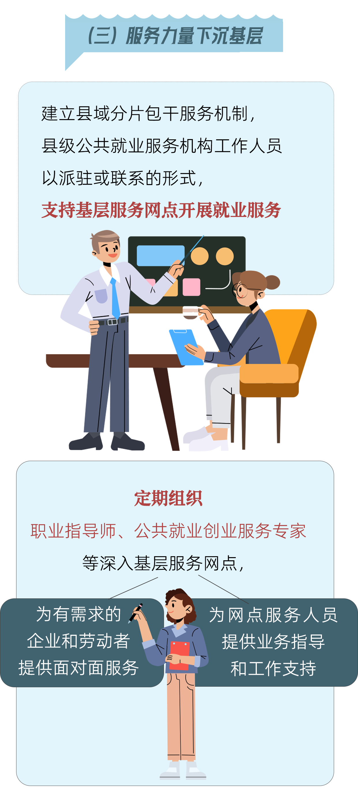 近日,人力资源社会保障部、财政部联合印发《关于推动公共就业服务下沉基层的意见》,力争用2至3年时间,打造一批具有示范引领性的基层就业服务网点,加快形成上下贯通、业务联通、数据融通的基层就业服务格局,增强公共就业服务的均衡性和可及性。