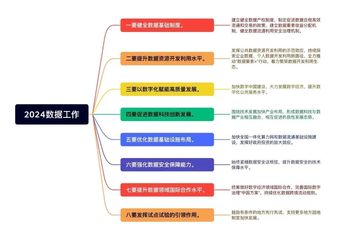 这是国家数据局正式挂牌后的首次全国数据工作会议。会议指出,2024年数据工作要大力发展新质生产力,坚持稳中求进工作总基调,坚持“一条主线”,统筹“三个建设”,着力健全基础制度、释放要素潜能、加快转型赋能、促进科技创新、完善基础设施、强化安全保障、推进国际合作、抓好试点试验,更好发挥数字化在中国式现代化中的驱动引领作用,奋力开创国家数据工作新局面。