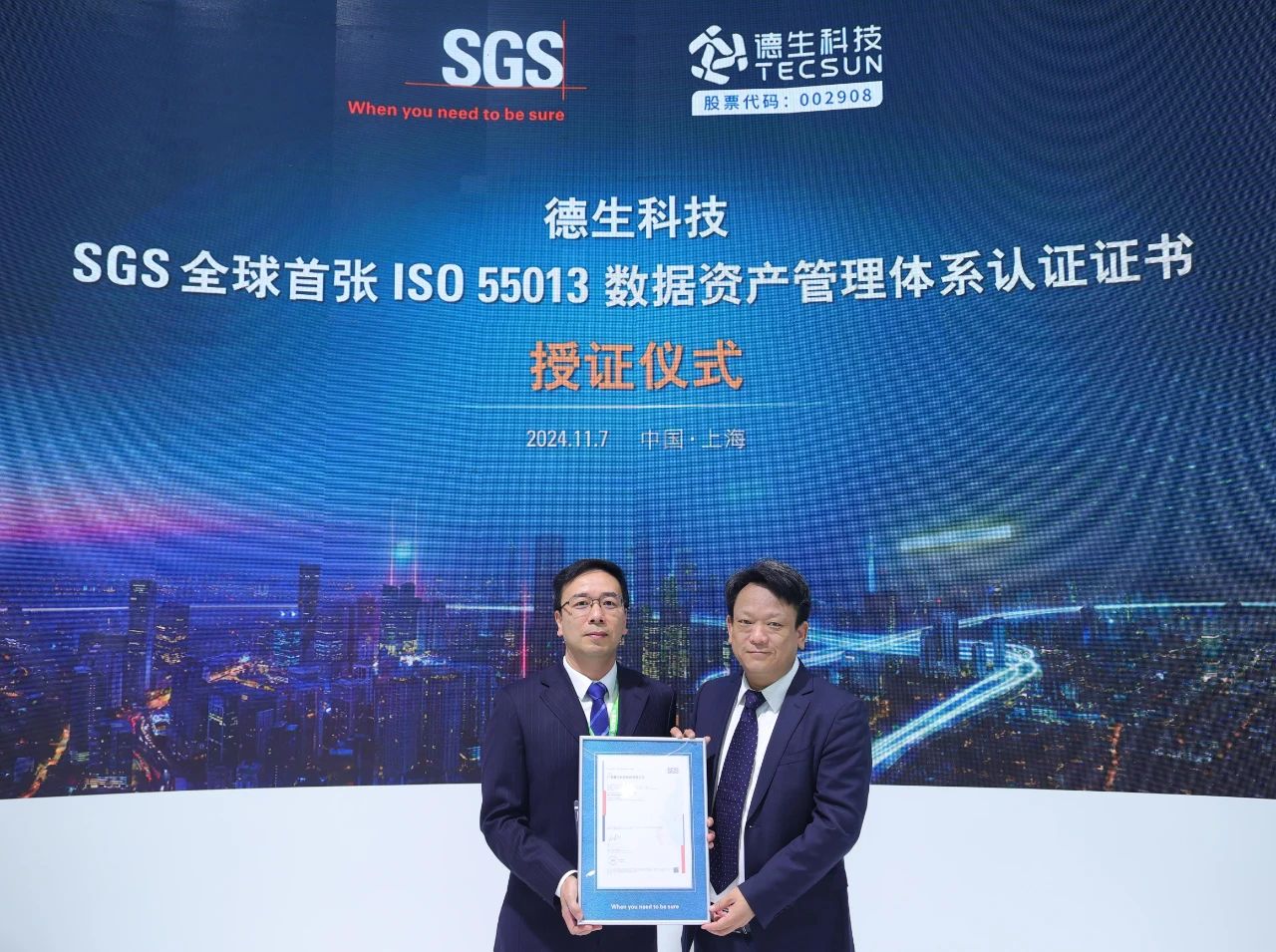 11月7日,在第七届中国国际进口博览会期间,国际公认的测试、检验和认证机构SGS为伟德bv1946官网颁发了SGS全球首张“ISO 55013数据资产管理体系认证”证书。