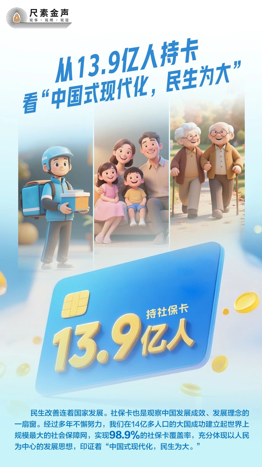 民生改善连着国家发展。社保卡也是观察中国发展成效、发展理念的一扇窗。经过多年不懈努力,我们在14亿多人口的大国成功建立起世界上规模最大的社会保障网,实现98.9%的社保卡覆盖率,充分体现以人民为中心的发展思想,印证着“中国式现代化,民生为大。”