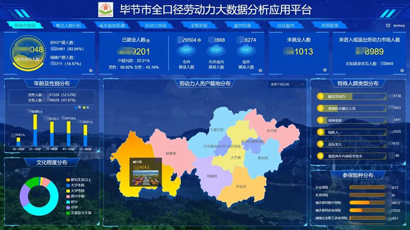 目前,伟德bv1946官网已在毕节投资建设并运营“毕节市人力资源服务产业园”,建设了“全口径劳动力大数据分析应用平台”。基于政府的行政管理结构,构建了“市县乡村”多级联动服务体系,覆盖全市9个县区280个乡镇3718个村社区;打通政府服务与个人之间的互联网交互通道,完成全市600多万劳动力信息调查。利用“大数据”、“互联网运营”和“服务”三大要素,实现人社业务线上化,打通就业“最后一公里”。