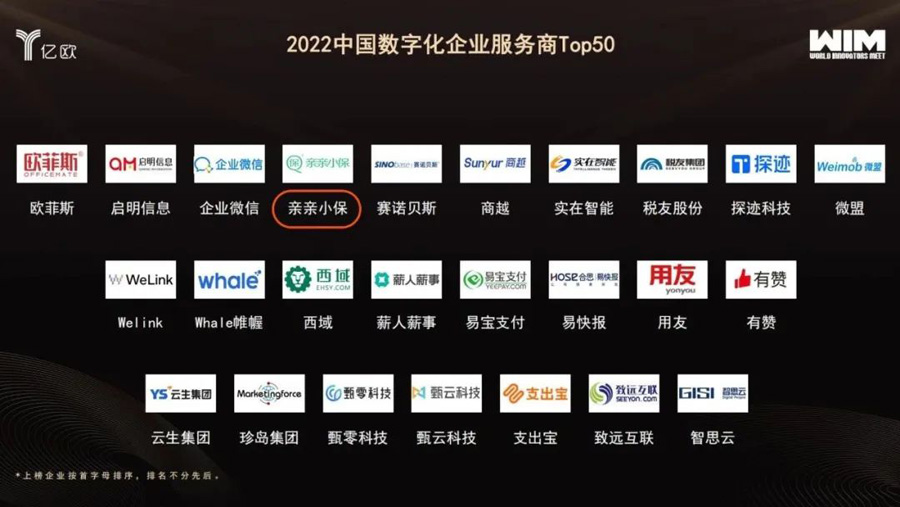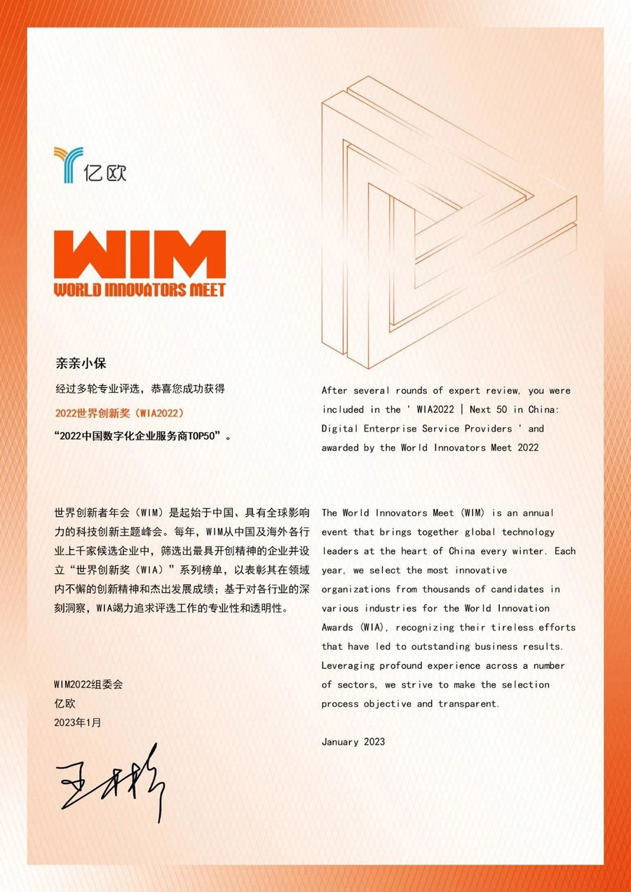 伟德bv1946官网子公司金色华勤旗下app亲亲小保凭借优秀的企业解决方案和扎实的数字化服务,荣登2022世界创新奖 (WIA2022) “2022中国数字化企业服务商TOP50”。作为国家高新技术企业,亲亲小保以企业服务为核心,针对企业的“人”与“业务”,依托先进的IT服务技术和资源整合的能力,聚焦人事代理、灵活用工、员工福利和企业拓展服务四大核心业务板块,借助自有品牌与技术产品“亲亲小保APP”“HRS100”“福利宝”“人才快递”等,匹配专业服务,为百万中小微企业、千万企业员工提供一站式的企业服务全面解决方案。