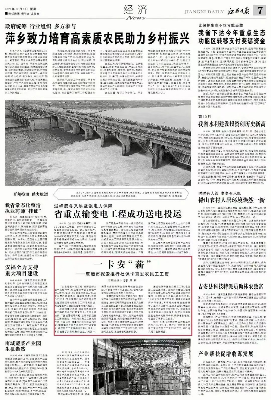 作为江西省惠民惠农财政补贴资金社保卡“一卡通”深度服务商,公司始终聚焦于民生需求,以社会保障卡为载体,以“大数据+互联网运营”为支撑,搭建社保卡“一卡通”资金发放监管服务平台,为群众提供智慧便捷的政务服务,实现资金发放数据核验、异常预警、及时发放、精准对接等规范闭环管理,提升政府监管效能,推进社保卡在民生领域的“一卡通用”。
